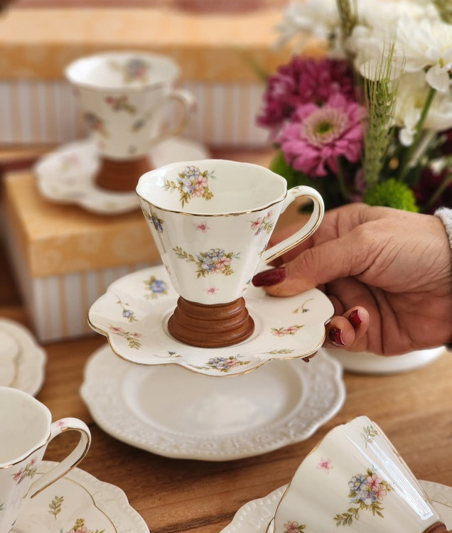 قهوه خوری گل دار پایه چوبی به همراه نعلبکی