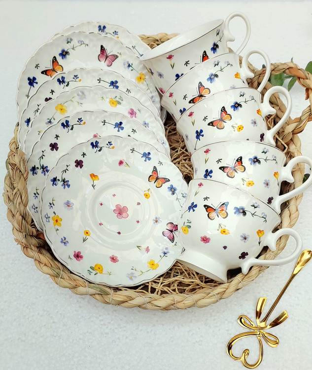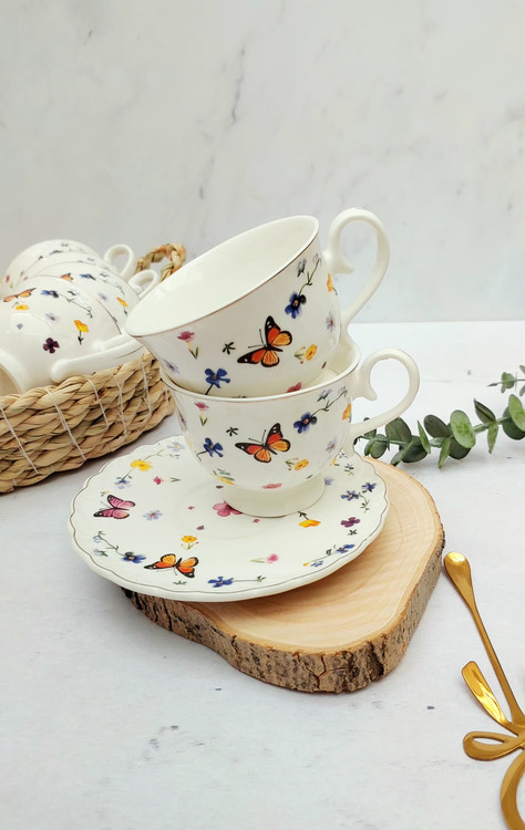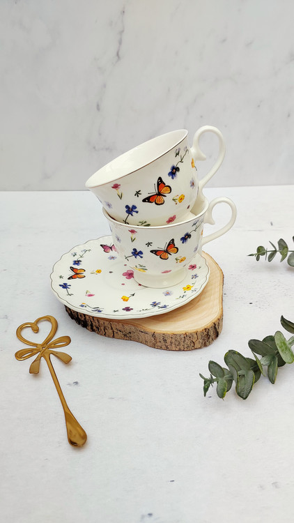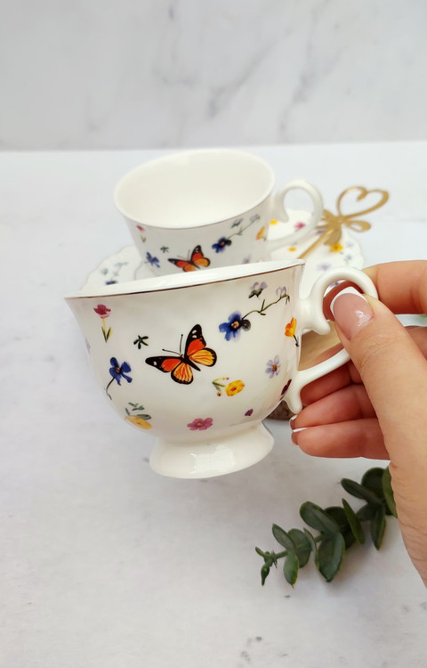 فنجان ونعلبکی پایه دار گل و پروانه